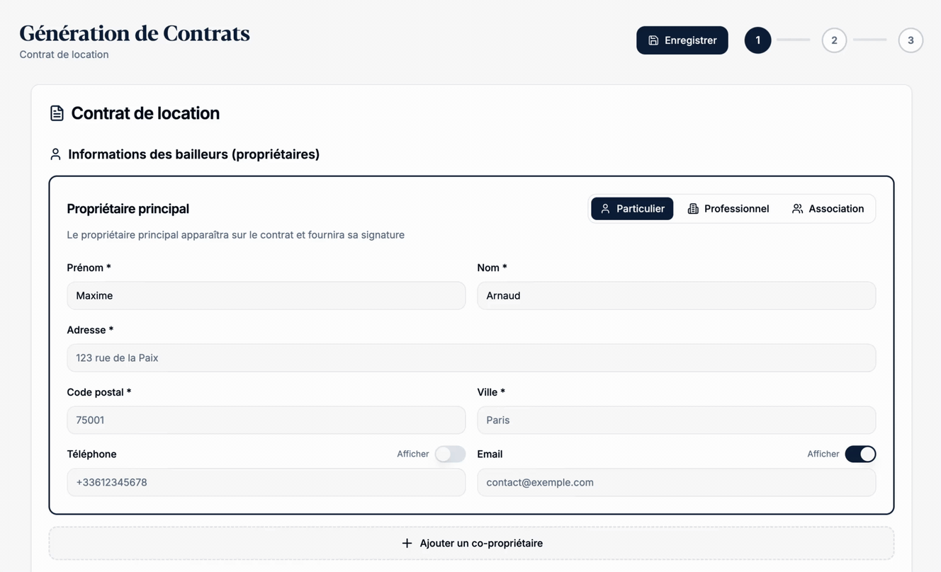 Les données de vos biens et contacts sont automatiquement injectées dans chaque nouveau contrat.